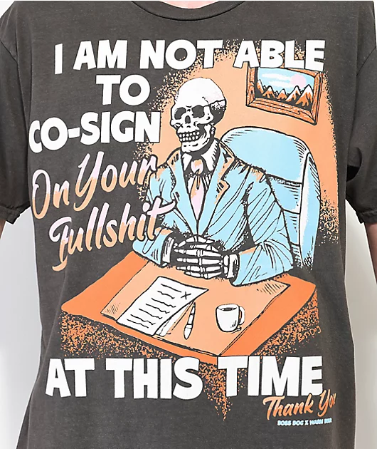 Boss Dog collaborates with Warm Beer for the Cosign black t-shirt, with a graphic of a passive-aggressive skeleton in a suit, and text reading \”I am not able to co-sign on your bullshit at this time thank you.\” The relaxed silhouette is made from soft 100