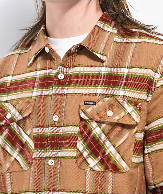 The Bowery flannel shirt from Brixton is made of a soft cotton-poly blend and comes in a light brown colorway with green and red plaid patterning throughout. This shirt has a classic turndown collar, dual chest patch pockets, and full button up closure wi