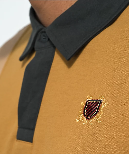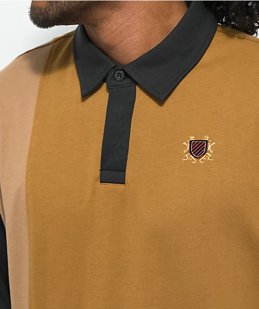 The Lion Crest long sleeve Brixton rugby shirt comes in a three-color construction featuring a tan colorway with black sleeves and a lighter tan stripe down the right side. This shirt has a classic rugby shirt construction including a stiff, turndown coll