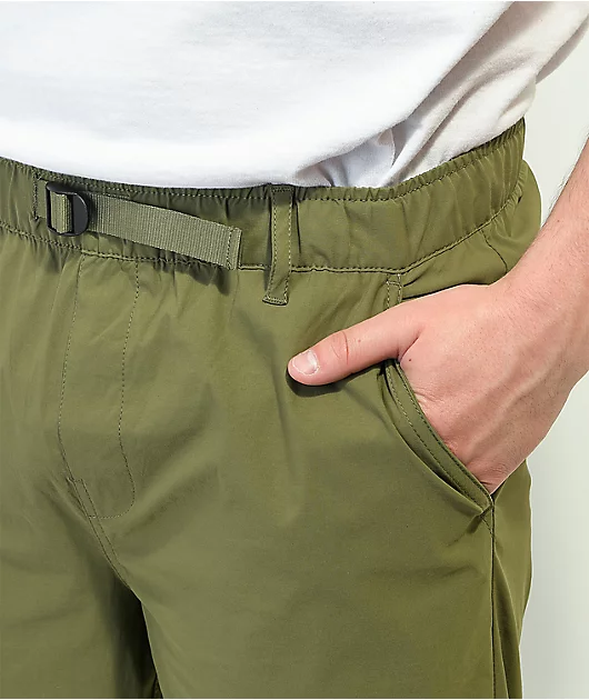 The Steady Cinch Brixton pants come in a tapered construction with a cinched waistband held together by a tension buckle. These pants have a green colorway with a small brand logo sewn above the back, right patch pocket for subtle branding.
