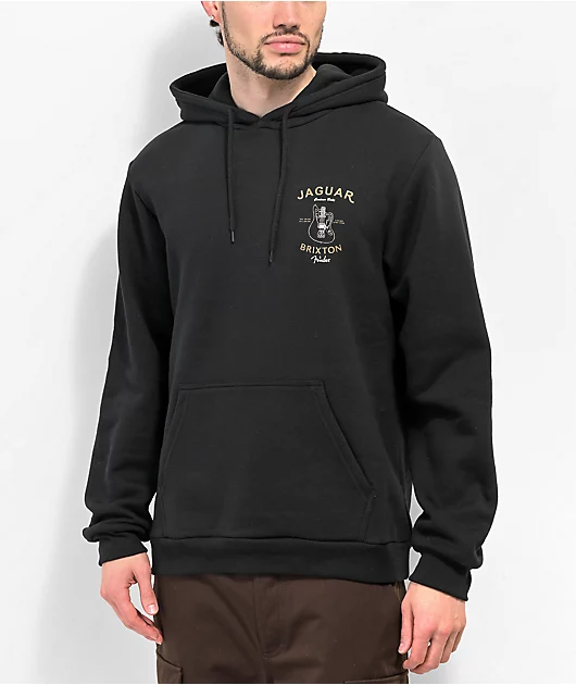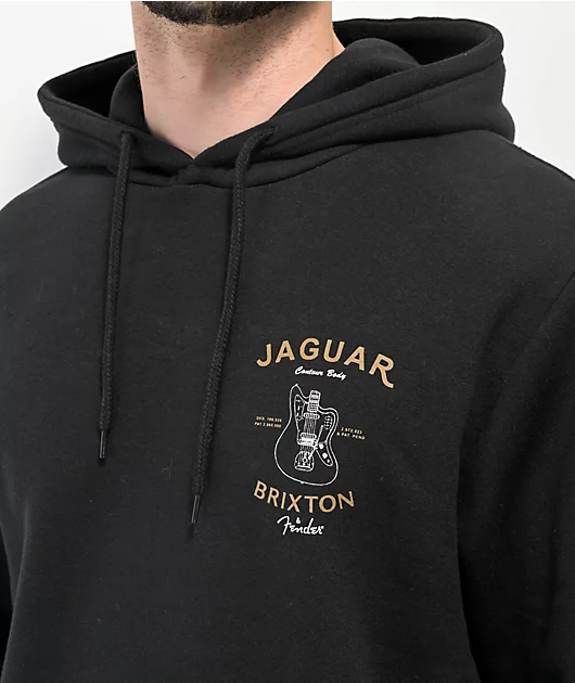 The Claws hoodie from the official Brixton x Fender collaboration is made of a soft cotton-poly blend and comes in a black colorway with a screen-printed collaboration graphic of a Jaguar electric guitar body on the front and back in gold and white.