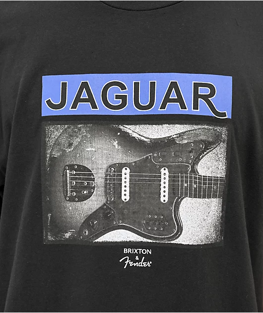 The Strangle t-shirt from Brixton x Fender is made of 100% cotton and comes in a black colorway with a screen-printed graphic across the chest boasting a retro Jaguar electric guitar model.