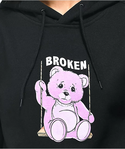 The Broken Promises’ Bear Guides black hoodie comes equipped with a soft, brushed interior and a drawstring-adjustable hood for comfort and style. The jacket features a screen-printed graphic on the front of a sad, cartoon bear on a swing and on the back