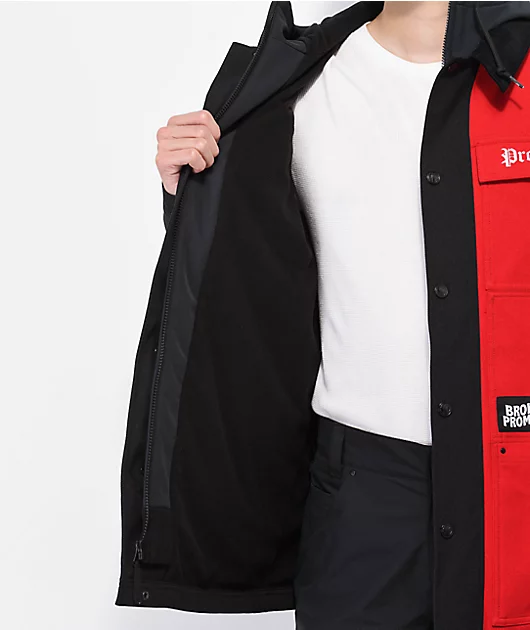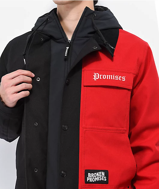 In a red and black split colorway comes the Bred snowboard jacket from Broken Promises, displaying brand script in white on the back of the hood, right sleeve, and left chest pocket. This heavy-duty winter coat offers a 10K water-resistance rating to ensu