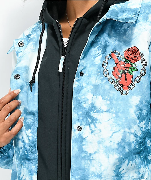 Fight the cold and look stylish doing it with Broken Promises’ Could Be Different white and teal tie dye snowboard jacket! This hooded, polyester-lined jacket is awash in a kaleidoscopic white and teal design, with their logo screen-printed across the bac