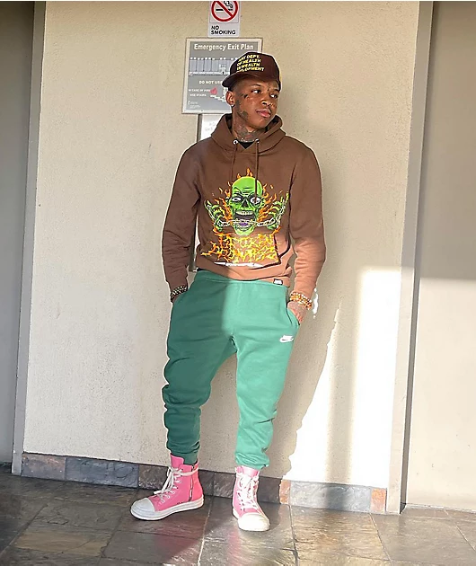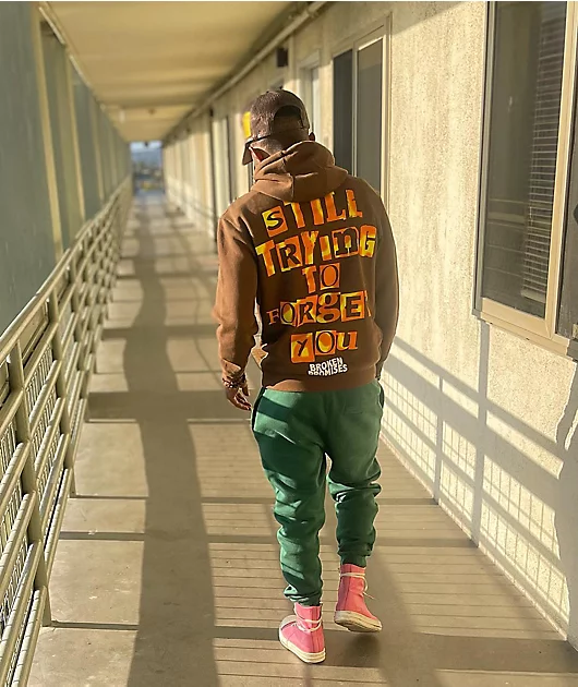 In a brown colorway comes the Forget You hoodie from Broken Promises, showing off the colorful image of a zombie biting a chains fire erupts around them. Brand script can be seen below in the same fiery orange accent to complete the look. This hooded swea
