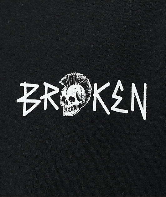 Made of 100% cotton, the Gutter t-shirt from Broken Promises comes in a black colorway with screen-printed, white brand script boasting a skull with a punk mohawk in the O of \”Broken.\”