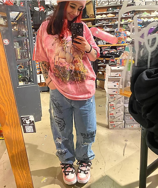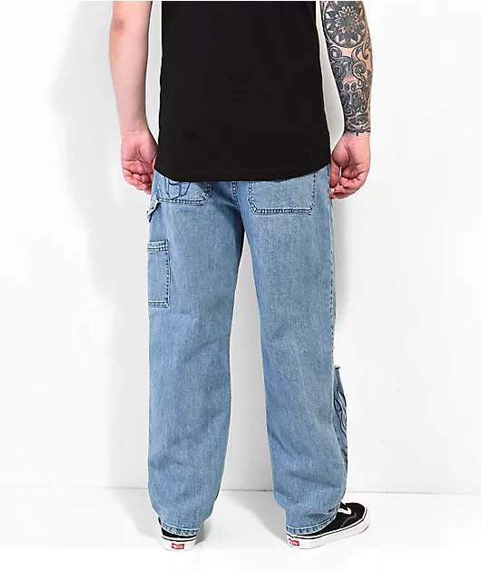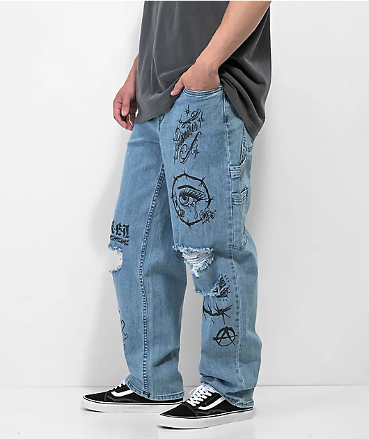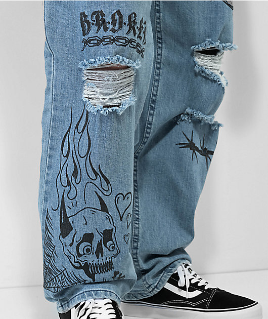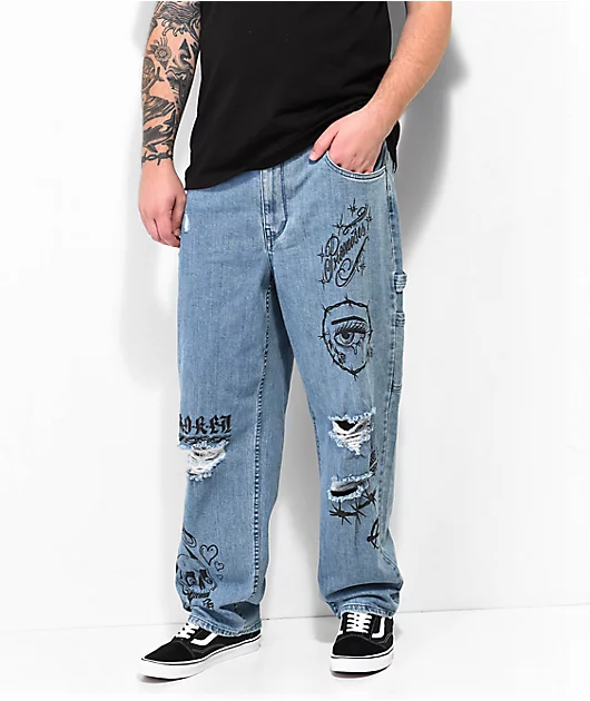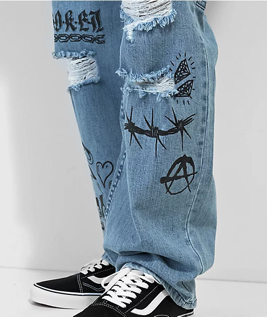 With a distressed look, the Jody carpenter jeans have a light blue wash and add a edgy look to any outfit pairing. The loose-fitting carpenter pants feature punk inspired graphics on the front, while the left seat pocket is embroidered with the Broken pro