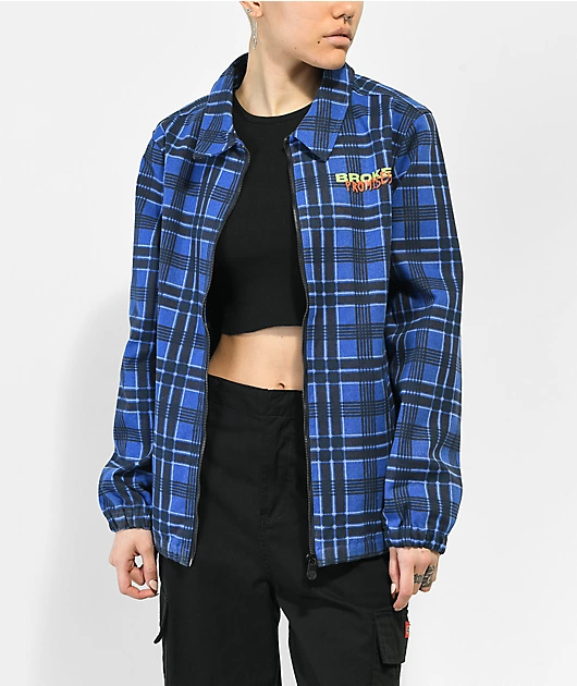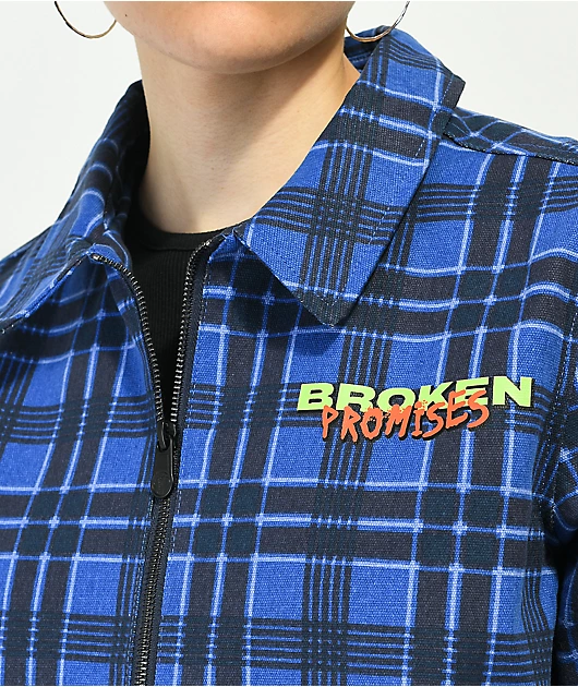 From Broken Promises comes the Leash work jacket in a blue plaid colorway, and it features punk-inspired dog walking imagery with script reading \”Can’t keep me on a fuxxing leash!!\” Broken Promises script can be seen screen-printed on the chest, while the