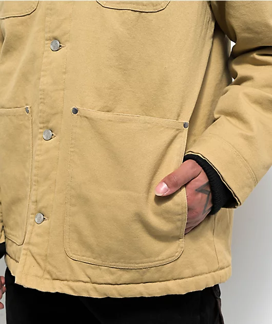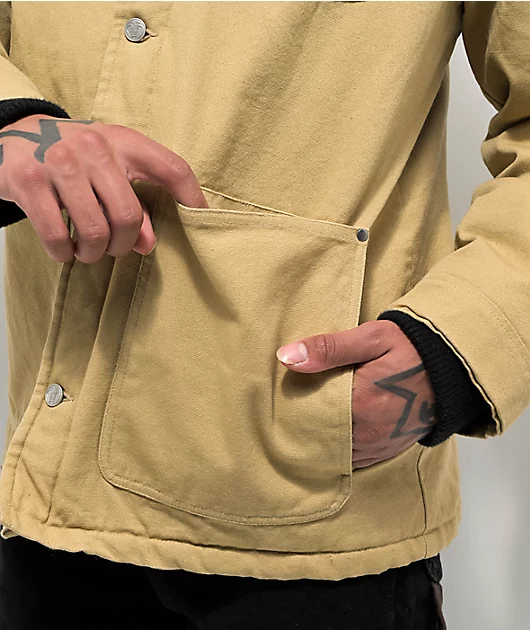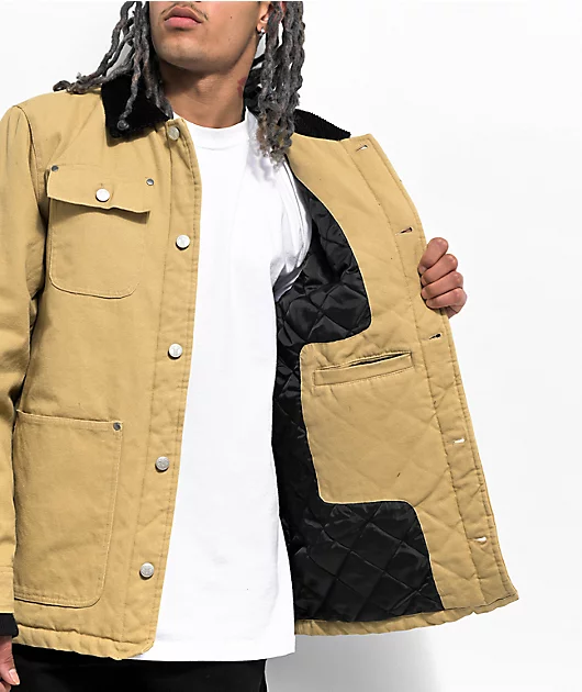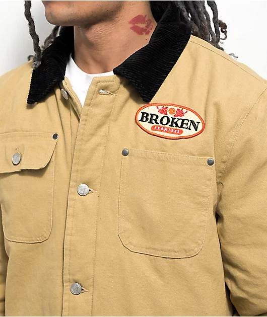 Broken Promises brings the Louis gas jacket in a khaki colorway, offering a classic look with a corduroy constructed turn down collar. This winter work coat offers ample storage with dual bellow pockets at the front, dual chest pockets, and an interior po