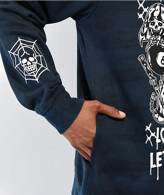 The Love Is Lethal hoodie from Broken Promises comes in a unique blue split dye colorway; injecting a dose of style and comfort to any outfit. Thickly printed graphics of an 8-ball, praying hands, and a reaper appear along the right side of the tie dye sw