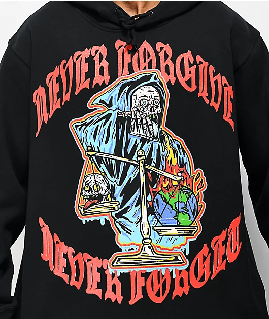 Add some wild style to your hoodie collection with the Never Forgive black hoodie from Broken Promises! This black hoodie features a large graphic at the center chest of the grim reaper burning a globe on a scale, with \”Never forgive, never forget\” for so
