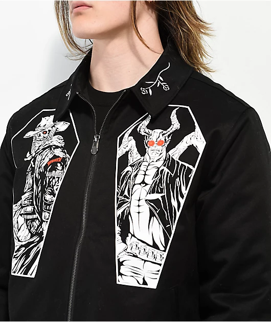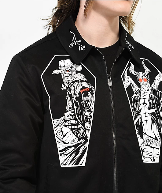 From Broken Promises, the Open Casket work jacket comes in a black colorway with an undead western motif. The full zip construction features a turn down collar with embroidered floral graphics in white, while images of a demon and a skeleton cowboy are sc