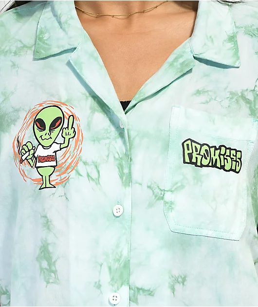 A green, crushed tie dye effect can be seen throughout the Outsider button up short sleeve by Broken Promises, constructed using breathable, lightweight rayon. A screen-printed graphic of a smoking alien pointing the middle finger and \”Promises\” script ca