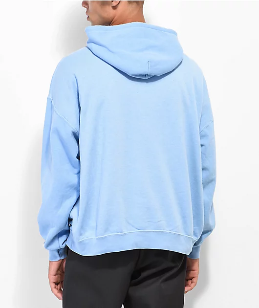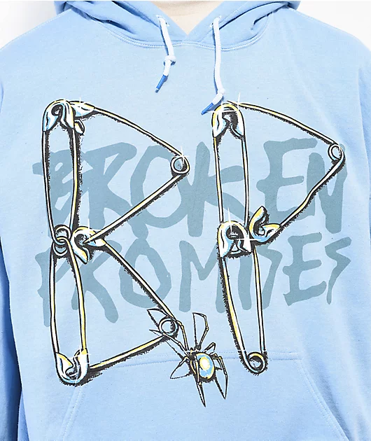 Thie Peircer hoodie from Broken Promises comes in a soft blue colorway, featuring a screen-printed graphic on the front of close pins forming together in the shape of the letters \”BP\”, while below is the image of a spider and the words \”Broken Promises\” s
