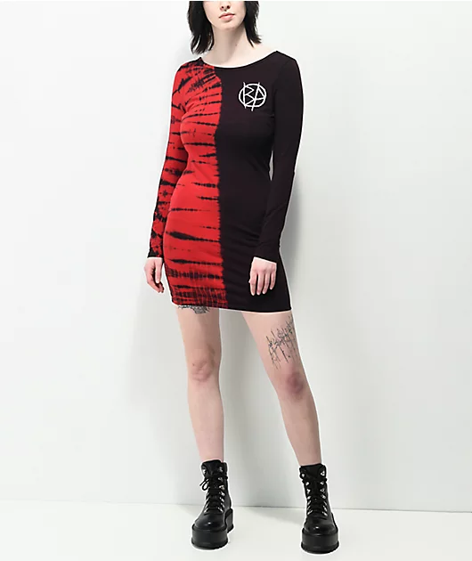 Splash a bold look into your dress collection with the Riot red split tie dye long sleeve dress from Broken Promises! This dress features a slim fit silhouette construction with an open back and a fixed strap, a vertically split red tie dye treatment thro