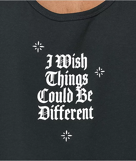 The Wishful Thinking muscle tank top from Broken Promises comes in black and features \” I wish things could be different\” at the chest in Old English lettering. The back of this graphic tee has a skeleton hand holding a red rose and the middle finger with
