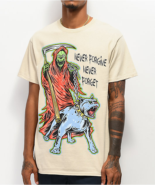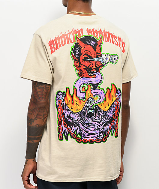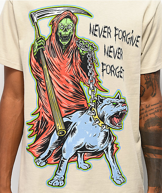 Show off your best style in the Worst In Me sand t-shirt from Broken Promises. The front of this tan tee features a large, neon screen-printed graphic of a grim reaper holding a chain leash of a large, evil dog and is highlighted by text on the side that