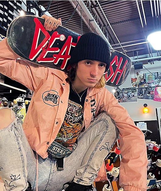 the misa coaches jacket from broken promises x death note comes in a pink colorway with black brand script on the front and a large back graphic of mi