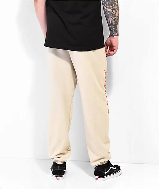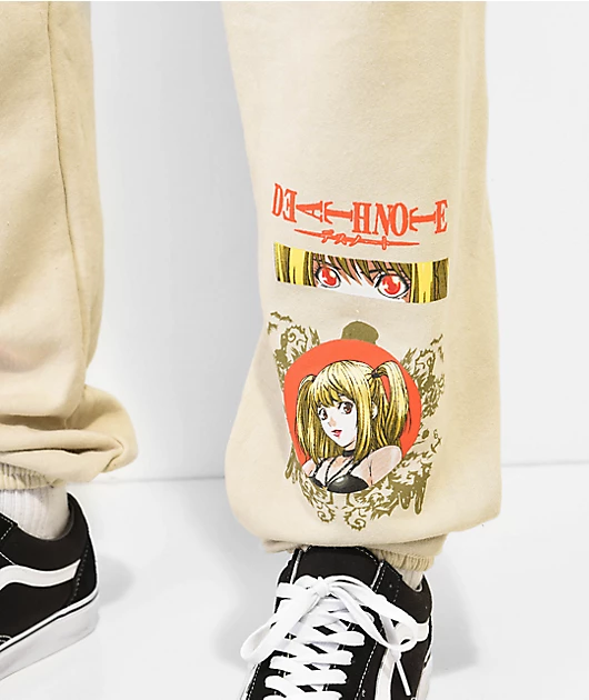an official collaboration between broken promises x death note brings the misa sweatpants in a sand colorway. on the upper left thigh is a graphic of