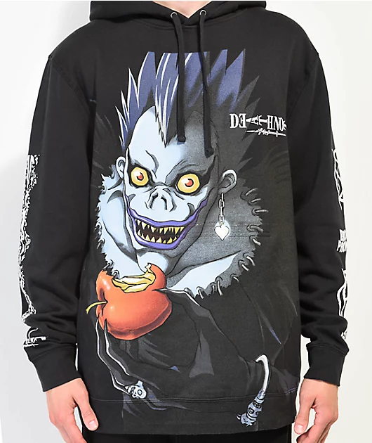 an official collaboration between broken promises x death note brings the ryuk hoodie in a black colorway. displayed on the chest is a large graphic o