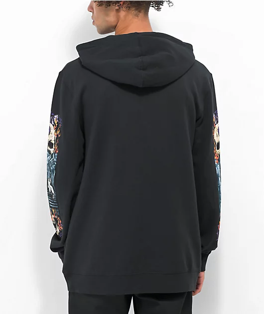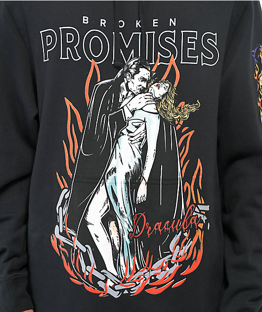 Perfect for any Dracula fan, the Bite Me hoodie from Broken Promises x Dracula comes in a black colorway with a screen-printed front graphic of Dracula drinking blood from a woman’s neck. Down both sleeves is a complimentary image of him carrying her th