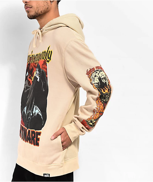 Perfect for any Dracula fan, the Nightmare Of Horror hoodie from Broken Promises x Dracula comes in a tan colorway, adorned on the front and down both sleeves with vampiric graphics. Surrounding script reading, \”You’re my only worst nightmare\” assists i