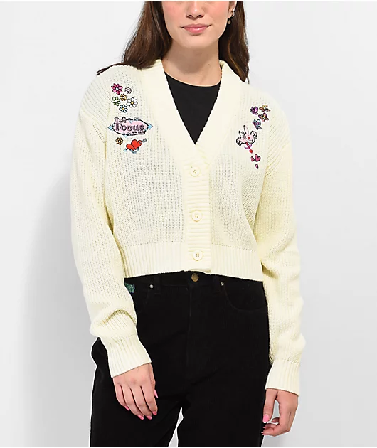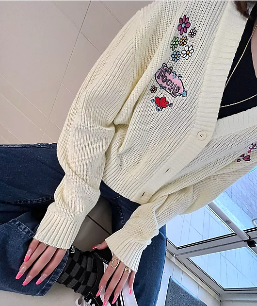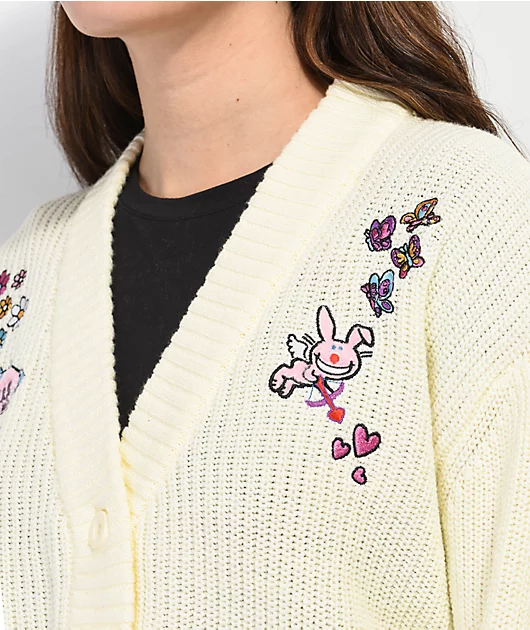 The Focus On Me ivory crop cardigan from Broken Promises x Happy Bunny has a button closure that gives it a vintage sweater feel and allows you to wear it multiple ways. With embroidered patches of butterflies, flowers and Happy Bunny, this cropped sweate