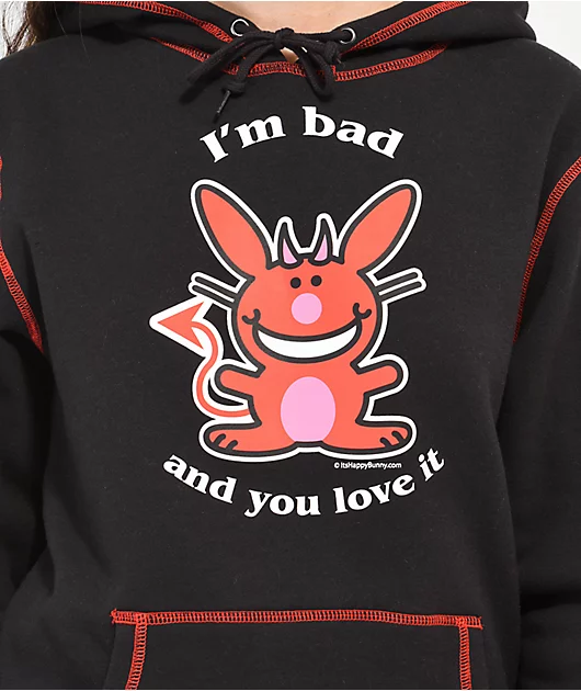 The I’m Bad Contrast hoodie from Broken Promises x Happy Bunny comes in a black colorway with red stitching and Happy Bunny graphics throughout including script reading, \”I’m bad | and you love it!\” This cotton-poly hoodie features a drawstring-adjustable