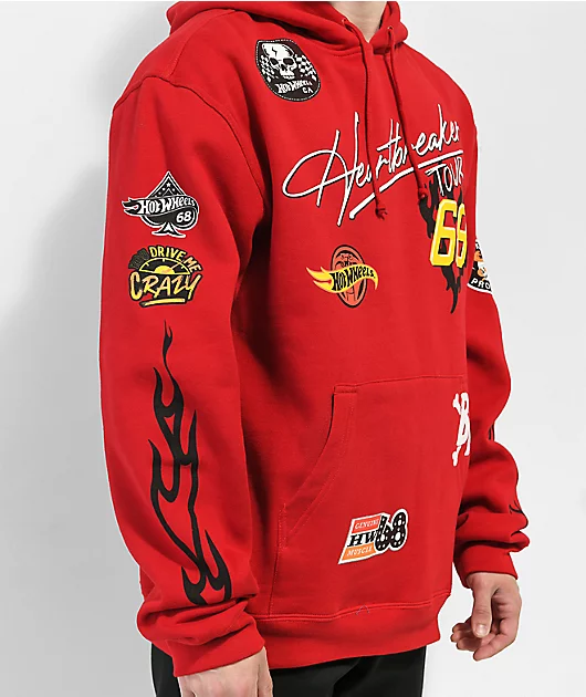 Broken Promises collaborates with Hot Wheels for the Heartbreak Tour hoodie in a red colorway. Inspired by vintage racing designs, the hoodie features screen-printed text reading \”Heartbreak tour\” across the chest, \”heartbreaker\” on the hood and collabora