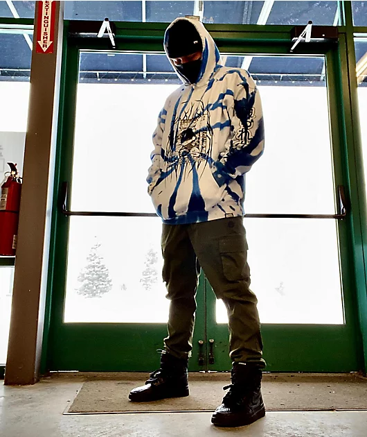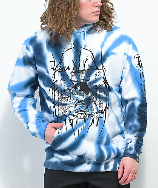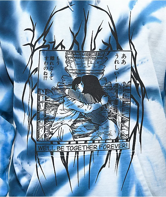 The beloved Japanese horror artist Junji Ito and Broken Promises come together to give you the Twisted Souls hoodie. This hoodie features blue and white tie dye throughout, and screen-printed graphics at the front, back, and sleeves, all of which were des