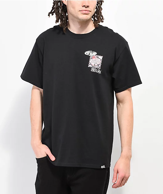 The Yesterday t-shirt from Broken Promises comes in a black colorway with a screen-printed graphic on the left of chest boasting brand script over a heart wrapped in razor wire. On the back of this shirt is a collage image featuring that same heart graphi