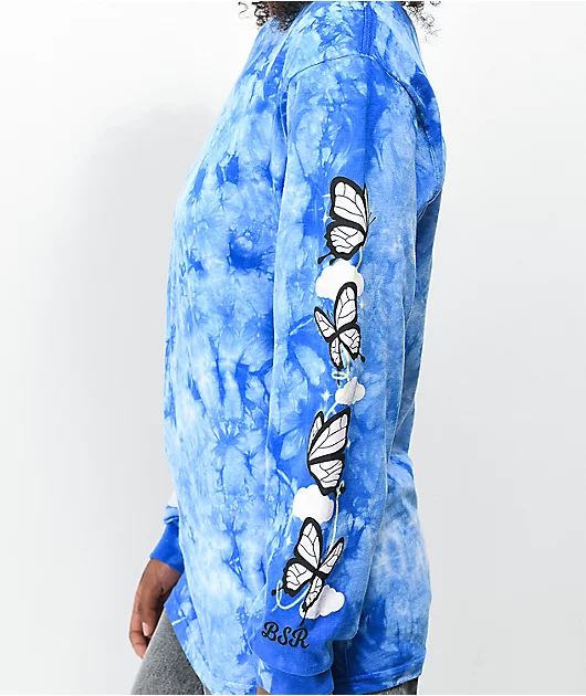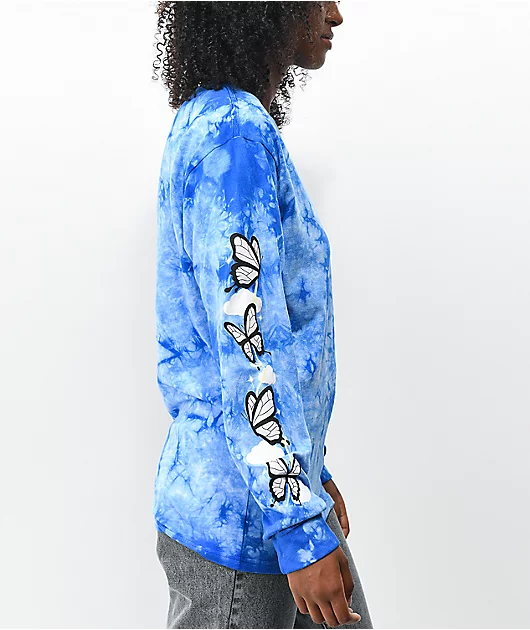 Bring a pop of color into every daily look with the By Samii Ryan Angel Butterfly tie dye long sleeve t-shirt. This long sleeve comes in a blue tie dye colorway for timeless vibes, while the butterflies printed down the sleeves offer some fun detailing to
