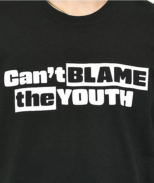 The comfy Blockbuster Can’t Blame The Youth shirt is made from soft, midweight cotton, and comes in a black colorway with a white, screen-printed script across the chest that reads, \”Can’t blame the youth.\”