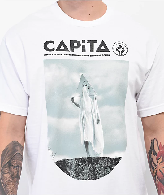 In a white colorway comes the DOA t-shirt from Capita, displaying the image of woman in a white dress and a glass triangle over her head on the front. This every day tee is made from a midweight cotton material, coming complete with a tagless neckline for