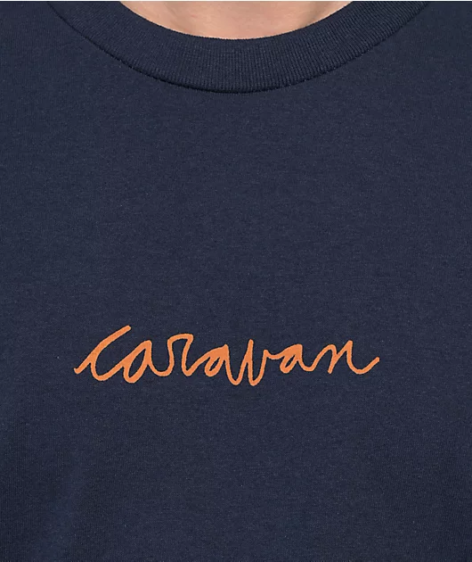 The Stamp t-shirt from Caravan comes in a calming navy blue colorway, with orange brand script screen-printed across the chest. The back of the shirt has a round orange Caravan logo, while the soft midweight cotton tee is complete with a ribbed collar and