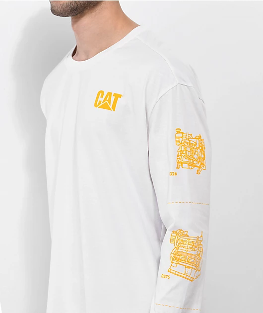 In a crisp white colorway comes the Engine long sleeve t-shirt from Caterpillar, showing the brand name left of chest in a yellow for contrast. Down the right sleeve is brand script, while down the left is a schematic for an engine that completes the look