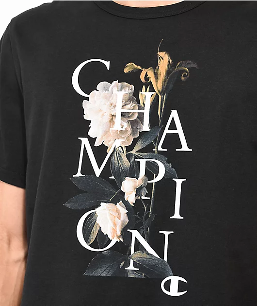 The Peekaboo black t-shirt form Champion comes made from a heavyweight cotton material, displaying a graphic of elegant flowers with Champion logo text peeking through on the chest in white for contrast.