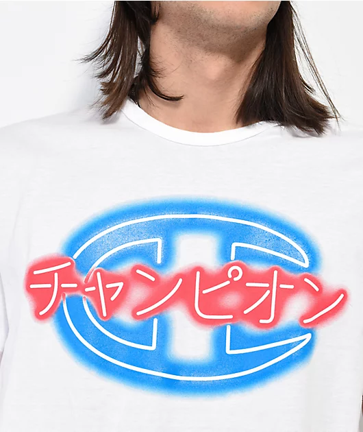 The Champion Kanji Neon C t-shirt comes in a white cotton construction with Japanese Katakana lettering on the printed across the chest. A red and blue neon glow accentuates the oversized Champion logo graphic, as the casual tee is finished with a brand a