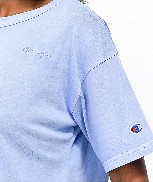 While away warm-weathered days in style with Champion’s lightweight charm blue crop t-shirt! Soft and flowy, this tee comes in an all-cotton construction, with a short-sleeved silhouette and cropped hemline keeping it comfortable. The periwinkle-toned hue