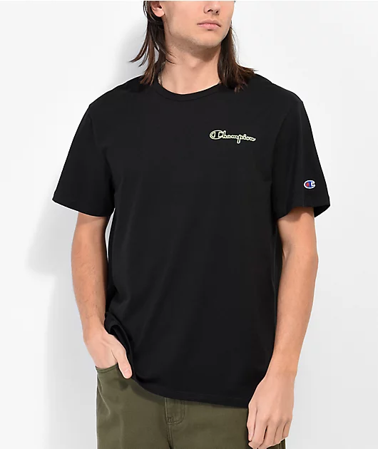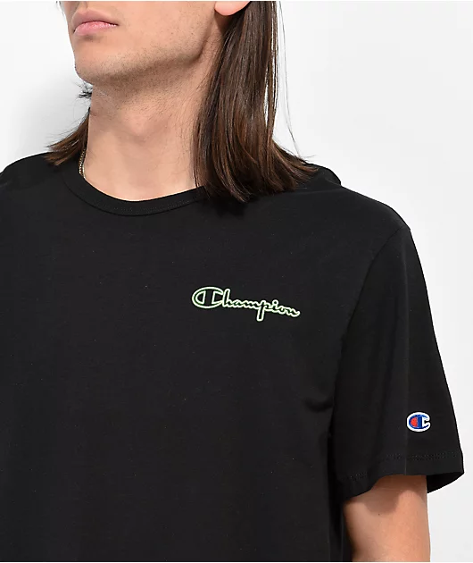 From Champion, the Lucky Cat t-shirt comes in a black colorway with a neon sign motif. The back features yellow japanese lettering which reads \”lucky\” while light green branding and an image of a beconing cat appears below. With subtle branding at the lef