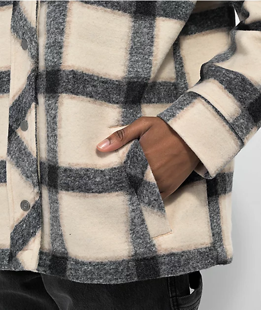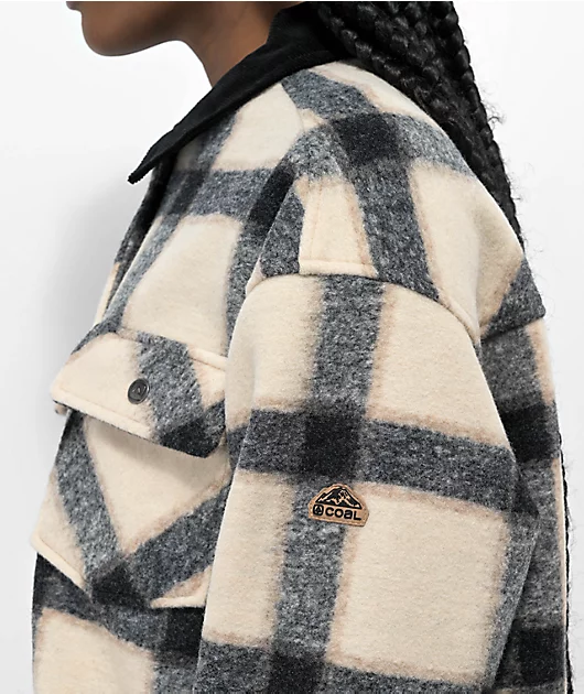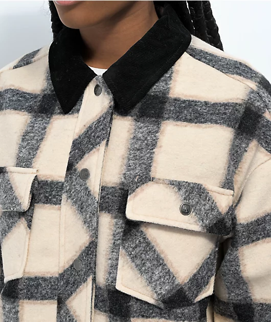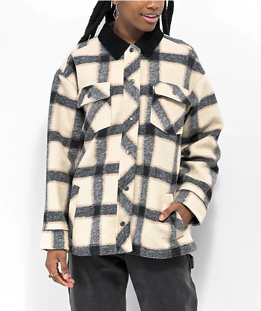 The Sheila shacket from Coal features a cozy plaid construction with cream white and black tones throughout. Boasting a full snap closure, the flannel shacket has an versatile oversize silhouette; making it a perfect layering piece. With dual chest and ha