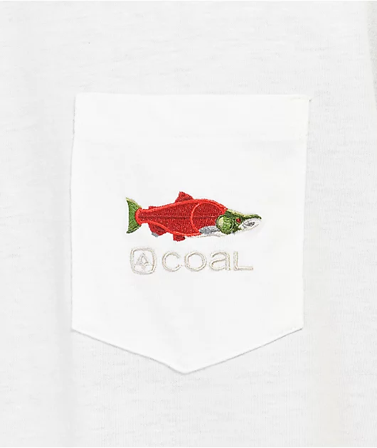 The Zypher Salmon Coal pocket t-shirt comes in a white colorway with a salmon embroidered over the brand name on the left chest pocket for a simple, outdoorsy look. This shirt is made of a cotton-poly blend with a regular fit for comfortable all day wear.