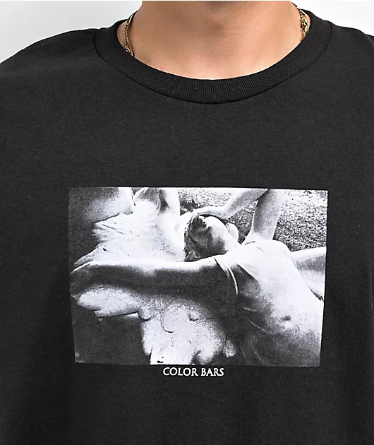 From the official collaboration between Color Bars and Joy Division comes the Love Will Tear t-shirt in a black colorway. This style is adorned on the front with the artwork of a grieving angel, utilized for the 12\” version of the single, \”Love Will Tear