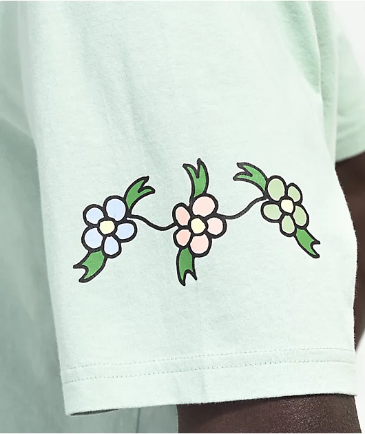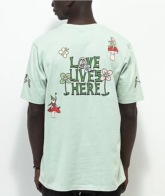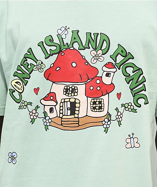 The Home Sweet Home short sleeve t-shirt from Coney Island Picnic is made from soft, midweight cotton, and comes in a pastel green colorway. Screen-printed on the chest is a graphic of a little mushroom house, flowers, and arching brand script; flowers ad
