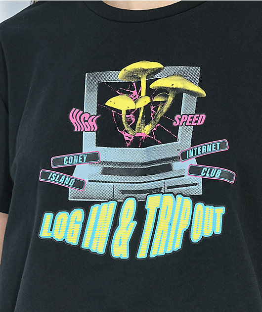 The Log In Trip t-shirt from Coney Island Picnic comes in a boxy, cropped construction, with a black colorway boasting a screen-printed graphic on the front of mushrooms coming out of a laptop screen and text reading, \”Log in and trip out\” as well as \”Hig