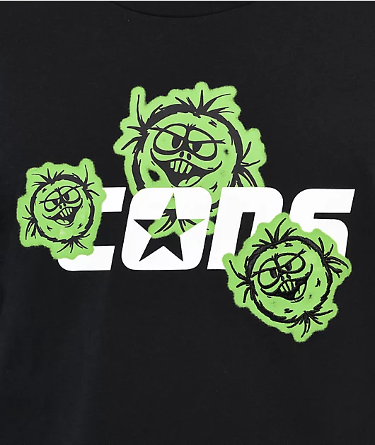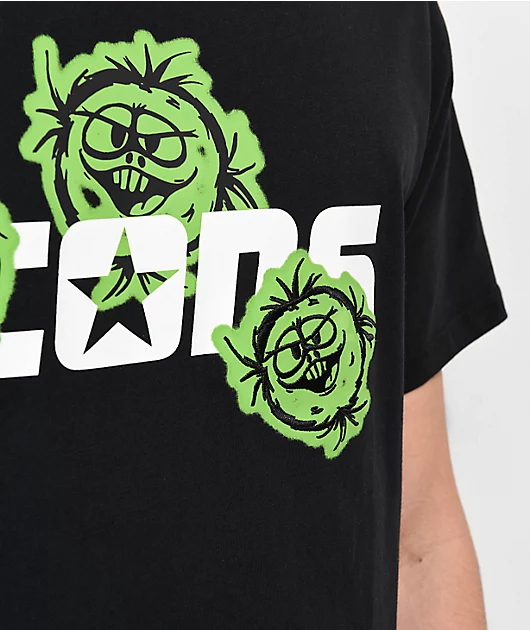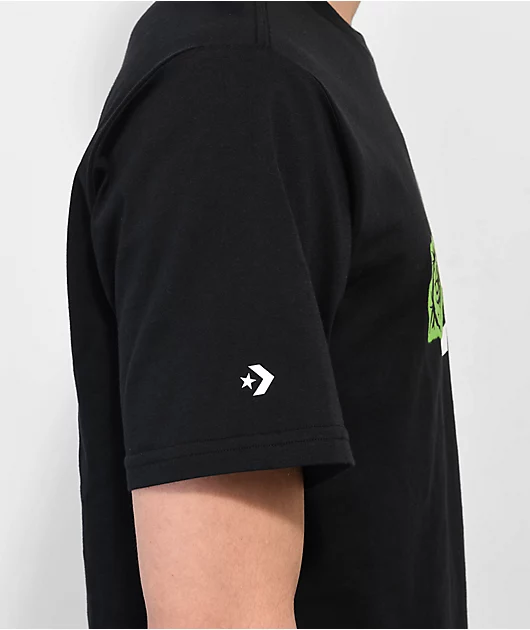 The 2000s t-shirt from Converse is made of 100% cotton and comes in a black colorway with white brand script and little green monsters screen-printed and embroidered across the chest.