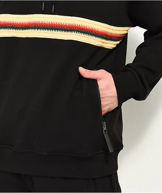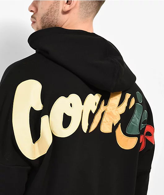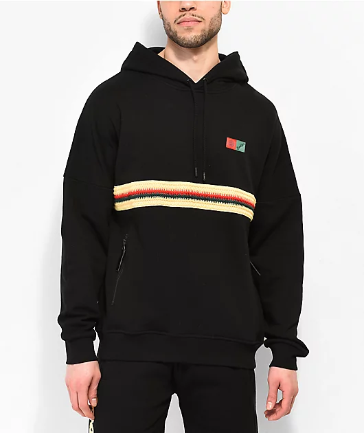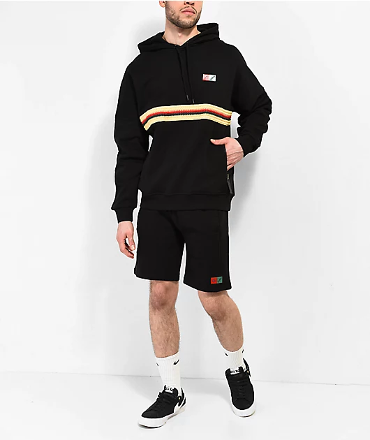 The Montego Bay hoodie from Cookies comes in a black colorway with yellow, red, and green stropes knit across the chest, a rubber brand tag woven onto the left of chest and yellow, embroidered brand script across the back. This boldly branded hoodie is ma