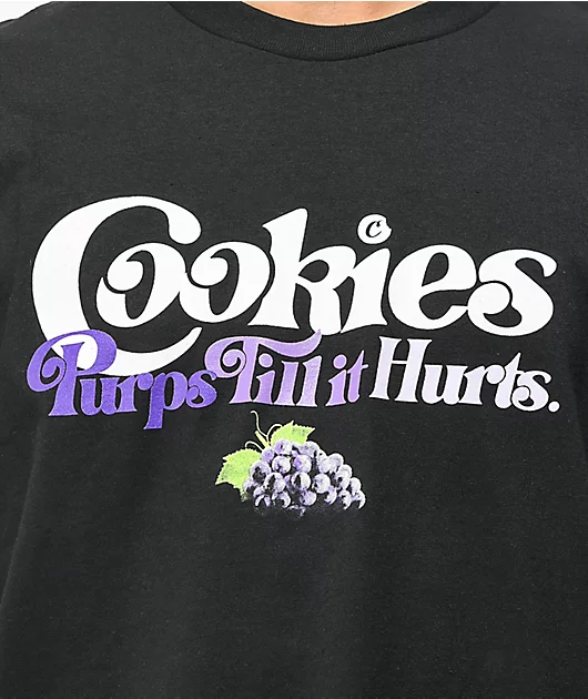 Finish off any look with an ode to your favorite fruit! The Cookies Purps Till It Hurts black t-shirt sports huge Cookies script at the chest, with the tagline \”Purps till it hurts\” written underneath. A bunch of purple grapes appear underneath the letter