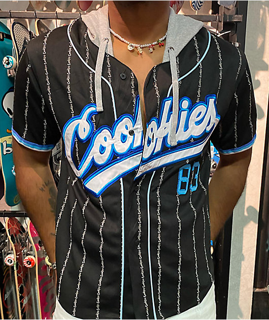 The Puttin In Work Cookies hooded baseball jersey has a short sleeve silhouette, a full button-up closure, and a V-neck collar with an adjustable grey hood. This Cookies jersey comes in black with white pinstripe brand text throughout, and Cookies brand e